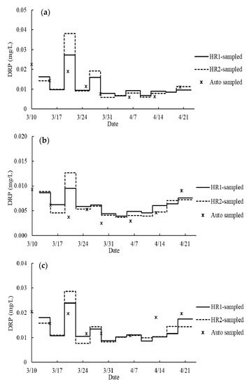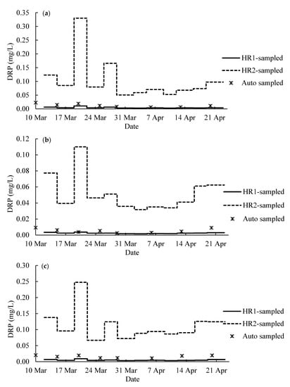 In contrast, the DRP concentrations calculated from RF generally fall in the same range as the auto-sampling DRP data (Figure 10). Statistical analysis showed no significant difference between the result of auto-sampling and passive-sampling, or between the passive sampling based on the field calibration data (p > 0.05) (Table 6). Similar trends of DRP data are shown in the data from the three sampling methods (i.e., hybrid resins and auto-sampler) (Figure 10). For example, a peak was observed on 19 March in Figure 10 and 10c except for the auto-sampled data of Tile 7. It corresponds to a heavy precipitation and a subsequent flood event (Figure 6 and Figure 8). The calculated DRP from hybrid resin-sampling were not always similar to the values from the auto-sampling. However, the auto-sampling data from the Agridrain system was single-point. It should be noted that the DRP data from the auto-sampler are discrete and may not capture quick changes in concentration due to increased flow. DPR concentrations in drainage waters could change even by an order of magnitude within a day [6,14,15]. It is possible that the calculated DRP from hybrid resin-passive sampling might reflect the actual DRP values since the hybrid resins during the passive sampling were continuously exposed to DRP in tile waters. In addition, a larger response of DRP increase during the flooding event on 19 March was shown by the data from hybrid resin-sampling, especially HR2, than by the data from auto-sampling. This overestimation is attributed to the following two reasons. First, this might be influenced by the entry of particulate P during the storm event. During the storm event, a substantial quantity of particulate P including colloidal P is released in tile water (Y. Arai, personal communication, 15 June 2020). It could also be affected by stagnant (non-flowing tile water) during peak flooding (L. Gentry. Personal communication, 25 June 2020).