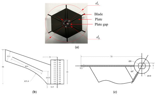 Photo and parameters of the impeller. (a) The photo of the impeller; (b) The side view of the impeller; (c) The top view of the impeller.