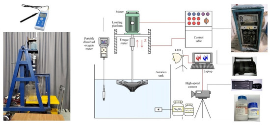 The experimental system mainly consisted of an inverted umbrella aerator, aeration tank, lifting device, portable dissolved oxygen meter, and high-speed photographic system. The schematic diagram is shown in Figure 2.