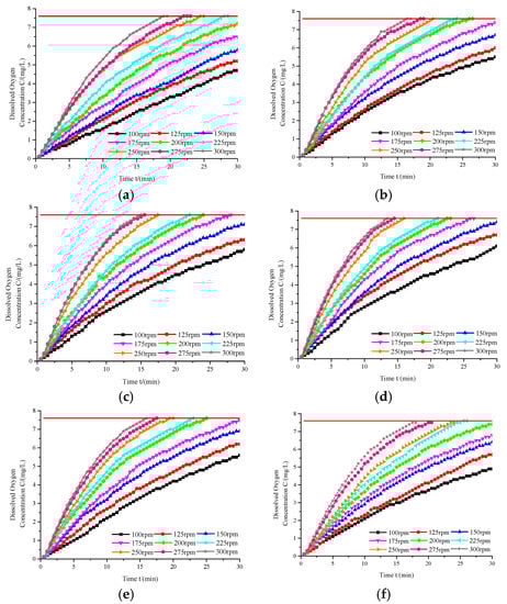 The time history plot of the dissolved oxygen concentration at different immersion depths and rotational speeds of impeller when the liquid level was 200 mm are shown in Figure 4. The red line in the figure represents the saturated dissolved oxygen concentration.