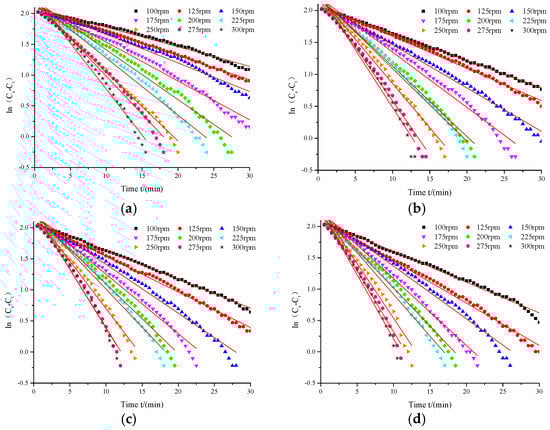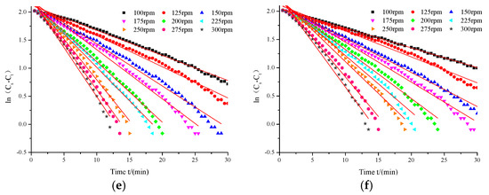 It can be seen from Equation (3) that oxygen mass transfer coefficient kLa is the opposite of the slope of the time history plot of logarithmic concentration ln (Cs − Ct). The dissolved oxygen concentration is converted to logarithmic concentration and scatter plot is made. Then the scatter point is linearly fitted. The curve fitting of each working condition has high accuracy, and the coefficient of determination R2 can be more than 0.98. The fitted lines are shown in Figure 5.