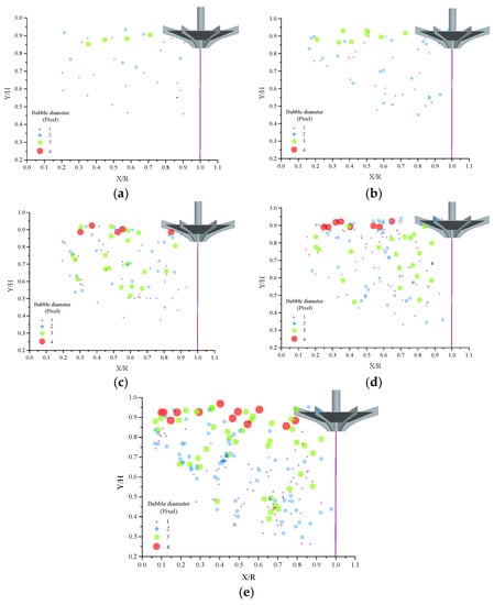 Bubble distribution at different rotational speeds. (a) 200 rpm; (b) 225 rpm; (c) 250 rpm; (d) 275 rpm; (e) 300 rpm.
