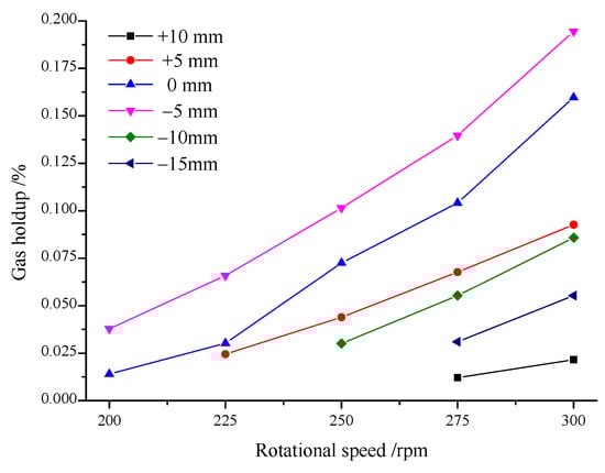The variation of gas holdup at different working conditions is shown in Figure 8. As can be seen from the figure, the rotational speed was different when bubbles first appeared under different immersion depths. The bubbles started to appear at the rotational speed of 175 rpm when the immersion depth was +10 mm, 0 mm, −5 mm, −10 mm, and −15 mm, and the bubbles started to appear at the rotational speed of 200 rpm when the immersion depth was +5 mm. Gas holdup tended to increase with an increase of rotational speed. Gas holdup first increased and then decreased with a decrease of immersion depth, and the gas holdup was the highest at the immersion depth of −5 mm.