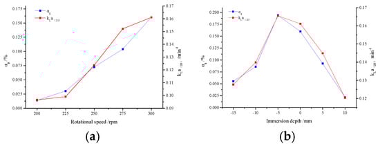 Figure 9a shows the variation of gas holdup (αg) and the standard oxygen mass transfer coefficient at different rotational speeds when the immersion depth was 0 mm. From the figure, the two have the same trend. Both of them showed an increasing trend with an increase of rotational speed at the certain immersion depth. Under the same immersion depth, the larger the rotational speed of the aerator, the greater the gas holdup and the standard oxygen mass transfer coefficient. Bubbles had a great influence on the oxygen mass transfer rate. The contact area between bubbles and liquid increased with an increase in gas holdup, which made the oxygen mass transfer more intense. With the increase of the rotational speed, the turbulence intensity of liquid was enhanced, and the effect of the impeller agitation on bubbles and liquid was strengthened. The bubble collision caused their coalescence, and large size bubbles moved towards the free surface after coalescence. The contact areas between liquid and air were increased, and the process of free surface mass transfer was strengthened.