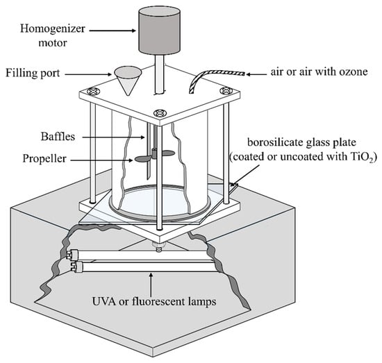 Experiments were performed using a custom-built stirred tank reactor (STR) based on a previous study [], as shown in Figure 1 and specifications reported in Table 2. The STR was made from food-grade stainless steel (Type 304) in the form of an open-top-bottom cylinder (Figure S1a) with baffles on the side walls. The bottom of the cylinder was fastened to a borosilicate glass plate (Figure S1b), either coated or uncoated with TiO2, to form the reactor chamber. A stainless steel propeller driven at 2000 rpm by variable speed overhead homogenizer motor (JJ-1 electrical stirrer, Zhengzhou Boke Instrument Equipment Co., Ltd.) was used to achieve optimal mixing conditions during experiments. For experiments under illumination, the STR was illuminated from below using two 11W UVA lamps (Actinic BL TL 11W/10, Philips lamp, Holland) or two 11W fluorescent lamps (MASTER PL-S 11W/840/4P 1CT, Philips Lamps, Holland) positioned in a wooden box with an air fan for cooling. Details of the spectral output of the lamps are shown in Figure S2.