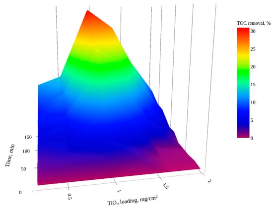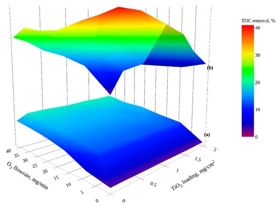Ozonation alone (Figure 4a: 0 mg TiO2/cm2) resulted in significant TOC reduction (maximum of 16% with an ozone flow rate of 41.7 mg O3/min). Ozone has a high oxidation potential and can attack organic compounds directly, however, mineralization (and therefore TOC reduction) is mainly reported to result from ozone decomposition into hydroxyl radicals [,] as described by [] and references there in Equations (11)–(14)