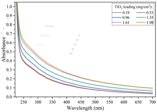 Absorbance spectra of the TiO2 coated films at different catalyst loadings (0.19–1.98 mg TiO2/cm2).