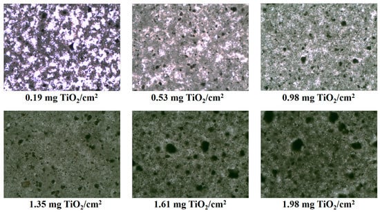 Whilst mineralization increased as a function of TiO2 loading, TOC removal at catalyst loadings of 1.61 and 1.98 mg TiO2/cm2 was not enhanced, potentially due to the saturation of the active sites and also the limited visible light penetration through the thick films [], as demonstrated in Figure 5.