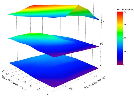 TOC reduction by H2O2/TiO2 (a) in dark conditions (b) with visible light, and (c) with UVA irradiation as a function of H2O2/TiO2 molar ratio and TiO2 loading (interactive plots presented in Figures S6–S8).