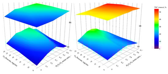 In experiments without TiO2, peroxonation and UVA-peroxonation (Figure 7a,c), the enhancement decreased with high H2O2/O3 molar ratios, with an optimal ratio observed between 0.3 and 0.5 in line with previous studies [,,]. Excess hydrogen peroxide has been reported to lead to hydroxyl radical scavenging [,]. We observed that a maximum TOC removal with an ozone flow rate of 25 mg/min (30.31%) was achieved by peroxonation (at 0.5 H2O2/O3 molar ratio) with UVA-peroxonation (at 0.3 H2O2/O3 molar ratio) increasing TOC removal to 34.97%.