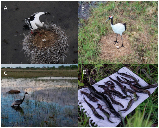 - Winter, S.W. Diet of the Oriental White Stork (Ciconia boyciana Swinhoe) in the Middle Amur region, USSR. In Biology and Conservation of the Oriental White Stork Ciconia Boyciana; Savannah River Ecology Laboratory: Aiken, SC, USA, 1991; pp. 31–45. [Google Scholar]