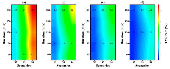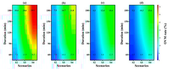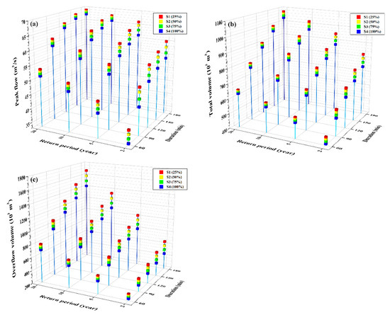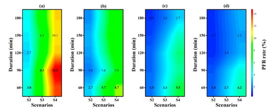 - The greatest reduction occurred in scenario (S4) with 100% PBP. Furthermore, PF, TV, and OV decreased with rainstorm RP, and the mitigation effect of OV (15.4–30.6%) was mostly higher than that of PF (4.2–13.5%) and TV (4.2–10.5%).