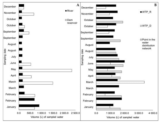 Volumes of water sampled in 2019 at the five sampling sites under survey, aimed at detection and quantification of enteric viruses. (A) River and dam reservoir (n = 27). (B) WTP_R, WTP_D, and point in the water distribution network (n = 36).
