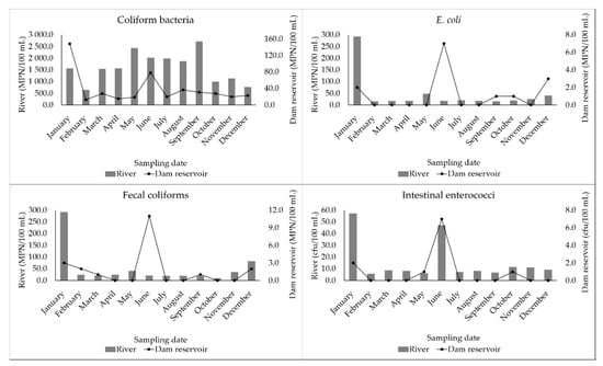 Coliform bacteria were detected throughout the sampling campaign, in concentrations of 644–2714 MPN/100 mL in the river and 13–148 MPN/100 mL in the dam reservoir (Figure 2). Fecal coliforms were detected in the river, throughout the 12 months of the sampling campaign, at concentrations of 9–291 MPN/100 mL, whilst in the dam reservoir they were detected in six of the twelve months, at a maximum concentration of 11 MPN/100 mL (Figure 2). E. coli was detected in the river, throughout the sampling campaign, at 291 MPN/100 mL in January and under 50 MPN/100 mL in the other months. In the dam reservoir, E. coli was detected in five months, at concentrations ranging from 1 to 7 MPN/100 mL (Figure 2). Intestinal enterococci were also detected during the 12 months of the sampling campaign, in the river at 12–57 cfu/100 mL and during four months in the dam reservoir, at concentrations below 7 cfu/100 mL (Figure 2).