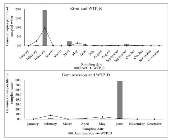 Although Enterovirus RNA was detected in one sample from the dam reservoir, it was not found in the drinking water collected at the outlet of WTP_D. NoV II RNA evidenced a 98.9% decrease after treatment in a single sample, and no decrease or slight increments in the remaining samples; HAV RNA, not previously detected in dam reservoir samples, was detected in a drinking water sample of WTP_D, at 0.1 gc/L (Figure 3, dam reservoir and WTP_D).