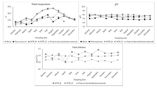 Physical-chemical characterization of the surface water and drinking water sampled during the 2019 sampling campaign (n = 96). The first and second graphs represent variations in water temperature and water pH, respectively, throughout the sampling campaign, at the five sampling sites (River, Dam reservoir, WTP_R, WTP_D, point in the distribution network). The third graph represents the variation in total chlorine concentration, in the drinking water sampled throughout the sampling campaign, at the three sampling sites: WTP_R, WTP_D and point in the distribution network.