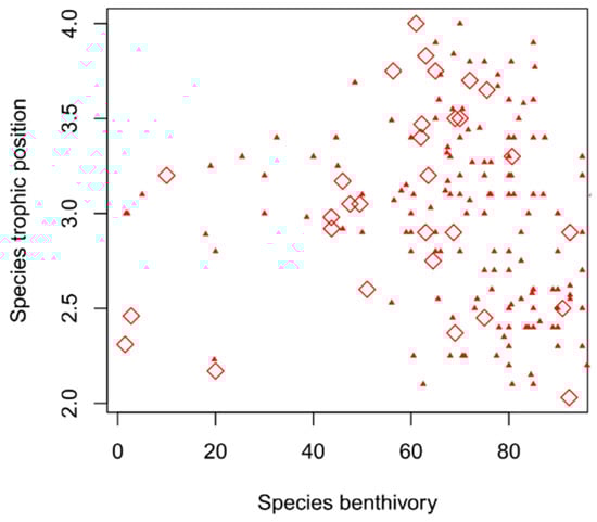 Species benthivory and trophic position of the 192 species in the trophic niche space comprising the species pool for the floodplain lakes. The 30 dominant species, present in half of the total 165 assemblages, are represented by open diamonds.
