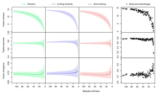 Simulated and observed food web properties as a function of species loss. The lines and shaded areas are the means and standard deviations of food web properties for the random, limiting similarity, and niche filtering scenarios. Squares correspond to the observed assemblages. The food web properties are arranged from top to bottom rows with trophic richness, evenness, and divergence. Note the species richness on X axis is arranged from large to small.