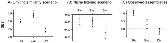 Differences in SESs (standardized error sizes) of food web properties. (A) Limiting similarity scenario; (B) niche filtering scenario; and (C) observed assemblages. Ric, Eve, and Div represent trophic richness, evenness, and divergence, respectively. Error bars represent the 95% confidence intervals. Asterisks indicate that the difference in SESs was significantly different from zero (p < 0.05; a two-tailed Wilcoxon signed-rank test).