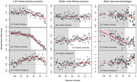 Standardized effect sizes of food web properties as a function of species loss. From left to right, subfigure (A,D,G) represents limiting similarity scenario, subfigure (B,E,H) corresponds niche filtering scenario, and subfigure (C,F,I) represents observed assemblages, respectively. The food web properties are arranged from top to bottom rows with trophic richness (A,B,C), trophic evenness (D,E,F), and trophic divergence (G,H,I). The relationships were fitted by piecewise linear regression (see Methods), and the solid thick lines represent the regression lines with significant slopes, while the dashed thinner line the non-significant ones. The location of the changing point (see the corresponding number of species in Table A2) is used to divide the response of food web properties into the species-rich (shaded) and species-poor (unshaded) assemblages. Horizontal dashed lines show zero effect size. Note the species richness on X axis is arranged from large to small.