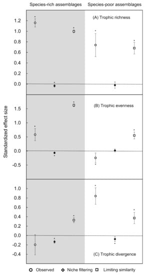 Standardized effect sizes of observed and simulated (niche filtering and limiting similarity) assemblages under low and high species richness (i.e., species-poor and species-rich regimes). (A) Trophic richness, (B) trophic evenness, and (C) trophic divergence. Error bars are 95% confidence intervals. Asterisks indicate that the difference in SESs was significantly different from zero (p < 0.05; a two-tailed Wilcoxon signed-rank test).
