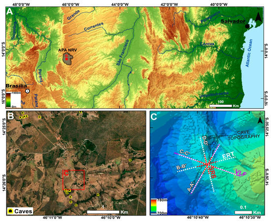 In Brazil, the following research works have been applied for the analysis of several caves across the country: [26,27,28,29,30]. However, no previous study has applied geophysical investigation to characterize the caves in the preserved area of the Mambaí, Goiás (River Vermelho) where borehole drilling is prohibited. The latest study, conducted in this area by the authors [2], indicated that Electrical Resistivity Tomography (ERT) and Very Low Frequency Electromagnetic (VLF-EM) are more effective than Ground Penetrating Radar (GPR), as the latter approach could not reach the required depth because of the highly attenuated nature of the cover material.