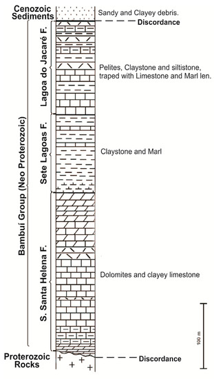 Locally, geology is marked by Cretaceous sandstone with continental and fluvial deposition from Urucuia formation and Proterozoic Carbonate and Claystone from the Lagoa do Jacaré Formation of Bambuí Group, linked by Cenozoic sediments from alluvial and colluvial deposits and detritus-lateritic cover [33]. The stratigraphic column of the nearby well is presented in Figure 2. In the study area, we can expect a stratigraphy with Cenozoic debris from colluvial and alluvial from the urucuia escarpment retreat on the top, and a sequence of Neoproterozoic formations (Lagoa do Jacaré, Sete Lagoas and Serra de Santa Helena) with Dolomites, Limestones and Marls trapped by clayey and silty levels (Figure 3).
