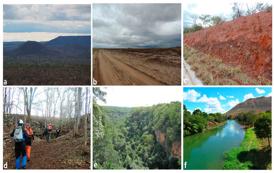 The northeastern region of the State of Goiás integrates several geomorphological domains which represent remnants of the oldest topography. It is drained by the Paranoá and Maranhão Rivers, which form the Tocantins River [32]. Locally, Urucuia formations control the escarpment, Lagoa do Jacaré formations controls the karst terrains and the alluvial and colluvial sediments form an almost flat talus. These geomorphological features are shown in Figure 3 as (3a) the escarpment; (3b) the very flat upper part of the sandstone; (3c) the formation of oxisoil; (3d) dolines opened in convex-concave hill-slopes covered by claystone; (3e) canyons compartment formed as a result of cave collapse; and (3f) the lower basing part, connected with the base level.