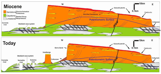 Conceptual model describing the formation of caves in the region. The cross-section of the landscape in the area formed by the retraction of the escarpment of Cretaceous sandstone from Urucuia formation, over Proterozoic carbonates and claystone from the Lagoa do Jacaré Formation of Bambuí group. The dotted blue line is the position of potentiometric surface, thick black lines are the positions of caves and yellow spots are silicified sandstone. Based upon [33,34].