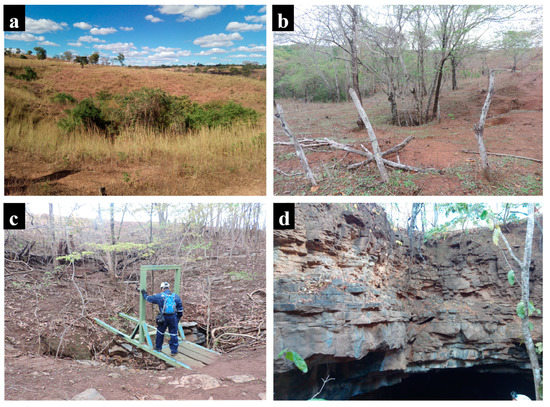 In the Brazilian states of Minas Gerais, São Paulo, Mato Grosso do Sul, Bahia, Ceará, Goiás and Tocantins host karst environments [31]. The study area (Figure 1) is located at the junction of the municipality of Mambai. The climate of the region is tropical, with dry and rainy seasons [32]. The Tarimba Cave, which is more than 11 km in length, has two known openings. It is one of the most important caves in the region (i.e., with a high level of biodiversity) and is one of the largest in the country in horizontal projection. These carbonate terrains belong to the Precambrian Bambuí group, and the western portion of the area is drained by the Tocantins River, flowing to the Amazon Delta region. The preservation area of the Vermelho River (2000 km2) lies in the Corrente Basin (4000 km2), where there are 164 mapped caves. There is strong geological control over the emergence of geomorphological units in the region with highlands and escarpment adjusted (i.e., eroded to the base level) to the cretaceous sandstone and karst terrain and lowlands within the carbonate. The study area presents a covered karst system, where the karst features are often located under claystone (Neoproterozoic) [2].