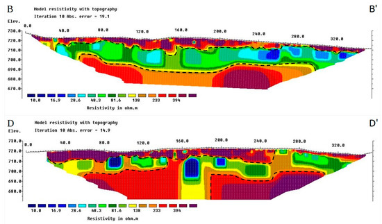 In the first stage of data preprocessing for the RMS error reduction, data filtering was applied to a raw ERT data record along ERT profile A-A’. Figure 6A represents the complete dataset (row data), while Figure 6B represents the dataset obtained after removing anomalous resistivity values (elimination of about 5%) during the initial processing step, which filtered out resistivity values greater than 1000 ohm. Inverse modeling at regular of 5 × 5 m2 cell spacing was applied, which resulted in the inverted resistivity model of filtered data (Figure 6C). The inversion of these data resulted in a model with an error of 21%. Finally, a reduction was made in the model grid size, in which cells of 2.5 × 2.5 m2 were used. In this way, the error was reduced to 19.9% (Figure 6E). For the other ERT sections, a similar approach was adopted, but only the final model with the topography was shown. Figure 6F shows the number of iterations and absolute error values for the different data types as (i) filtered, (ii) filtered and trimmed and (iii) filtered and trimmed with grid refinement applied for modeling. The error abruptly decreased in the first three iterations; after that, it remained unaffected with the increase of the number of iterations. The value of the error of filtered data was higher than the filtered-trimmed data (with or without the refined model) (Figure 6F).