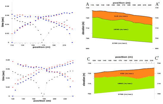 Travel-time vs distance graphs derived from the A-A’ and C-C’ refraction lines data and respective P-wave velocity cross-sections.