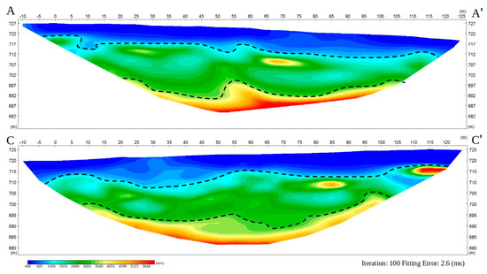 P-wave velocity tomographic models at the A-A’ and C-C’ seismic lines. The black dotted lines show the thickness of claystone (perched aquifer).