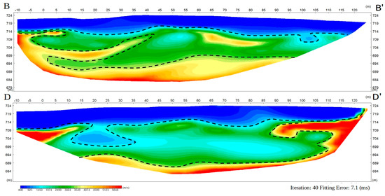 P-wave velocity tomographic models at the D-D’ and B-B’ seismic lines. The black dotted lines show the thickness of claystone (perched aquifer).