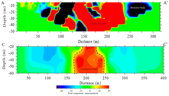 The VLF-EM data were qualitatively interpreted to determine the location of subsurface caves and filled sinkholes. The profiles (A-A’ and C-C’ performed in the study area) showed several anomalies that varies in both size and amplitude. The observed current density anomalies were divided into two main types, i.e., positive and negative, suggesting that the body is either a conductor or resistive, respectively [61]. The measured tilt angle (real component) for each frequency was presented in the form of contoured sections (Figure 14). On VLF-EM profiles A-A’ and C-C’, positive anomalies were detected at ~125 and 175 m, respectively, at horizontal locations (Figure 14). These anomalies were interpreted as conductive caves with water and filled dolines (Figure 14). These conductive anomalies were also observed on the ERT cross-sections of A-A’ sections and C-C’ sections. On A-A’, detailed surface structures (conductive and resistive) are visible, which are related to the 5 m station spacing during acquisition. On C-C’, a very prominent central conductive body can be seen (Figure 15). This is also visible in the ERT profile of this direction, which is linked with the filled sinkhole. Here in the VLF-EM profile, the body can be seen at greater depth.