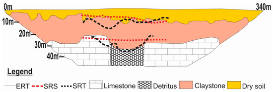Figure 15 represents an integrated interpretation of the ERT and outcomes of the two applied seismic refraction methods along the line C-C’. A well-defined, three-layered stratigraphy was obtained by all three applied methods. However, there were variations in the depth of each layer as reported by each method. In the case of the first dry layer, all methods gave similar results. There were small variations in the interpreted depth of the claystone layer. The central filled sinkhole was only observed on the ERT profile because of the limitation in the depth of penetration of these methods, as described above (Section 4).