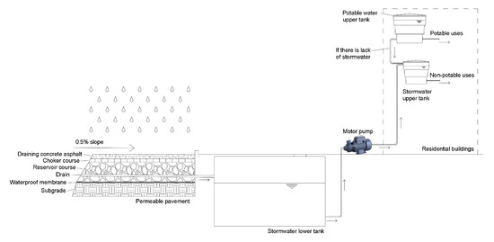 The permeable pavement model adopted was composed of a draining asphalt concrete layer, a choker course and a reservoir layer. There was also a waterproof membrane to prevent stormwater from getting to the subgrade. Figure 1 shows the permeable pavement model and the stormwater harvesting system proposed. All the layers were sized according to the American Society of Civil Engineers (ASCE) [26]. The thickness of the reservoir layer was calculated according to Equation (1).