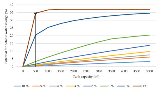 Figure 2 shows the potential for potable water savings in residential buildings for different tank capacities and varying percentages of paved road surface areas. The larger the tank capacity and the smaller the community size considered, the greater the potential for potable water savings. We considered a tank capacity equal to 500 m³ for each 0.1% of the paved area (community size of 612 people), which was considered sufficient to supply a large percentage of the nonpotable water demand in this region (34.5%), representing potable water savings equal to 31.7 m³/day. Regarding stormwater supply, this tank capacity would completely meet water demand for nonpotable purposes for 92.1% of the days in a year, partially for 3.0%, and not at all for 4.9% of the days.
