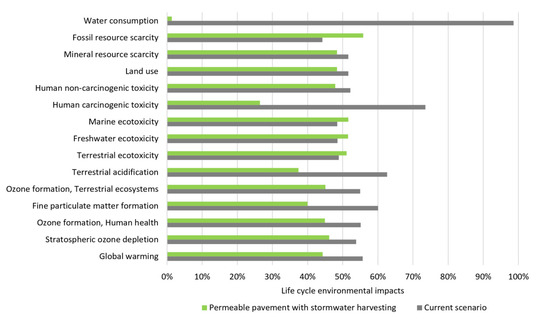 As for the lifecycle environmental impacts—even with the additional stormwater harvesting system (which requires the installation of pipes, connections, motor pumps, tanks, and valves, among others)—the permeable pavement system reduced the environmental impacts compared to the current scenario (traditional drainage system and conventional water supply). The greatest reductions were obtained in categories of water consumption, fine particulate matter formation (PM2.5-equivalent emissions), and global warming (CO2-equivalent emissions). The processes with the best opportunities for environmental improvements were heat production and petroleum processing, related to the HMA used in the traditional pavement.