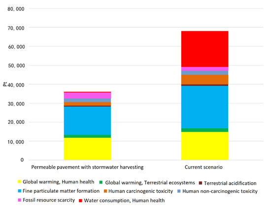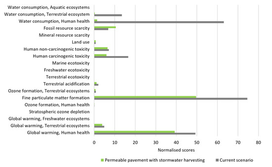 In the water consumption category, the impact for the scenario with permeable pavement and stormwater utilisation was 98.6% lower than the conventional scenario. This expressive result could be explained by the potable water production with conventional treatment in the current scenario, with this process having the greatest impact (50.9%). Also, the process of distribution of this potable water by the water utility contributed to the greater damages. In this category, the water consumed for potable purposes (showering, washing machines, drinking and cooking, washing up, etc.) was omitted in the assessment, as explained in Section 2.4.