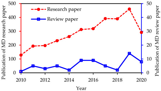 Figure 1. Number of publications on MD research papers and review papers from 2010 to August 2020 (obtained from Google Scholar).