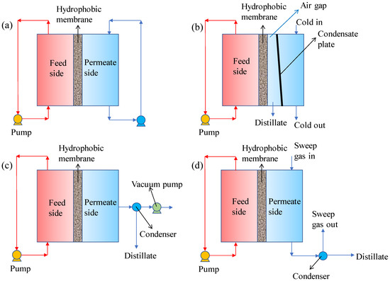 Figure 2 illustrates the schematic diagram of four typical MD configurations, including direct contact membrane distillation (DCMD), air gap membrane distillation (AGMD), vacuum membrane distillation (VMD), and sweeping gas membrane distillation (SGMD) [87,88]. The feed stream is in direct contact with the hydrophobic membrane in all these MD configurations. The membrane contacts directly with the cold permeate stream in DCMD, which is the most used design for research because of its simplicity. In AGMD, there is a stagnant air gap between the membrane and the cooling plate over which the vapor condenses. In VMD, a vacuum pump is applied to provide a driving force to induce the vapor to penetrate the membrane pores and condense outside the VMD chamber. In SGMD, an inert gas is used to sweep the vapor at the permeate side and condense at the outside of the MD module [89].