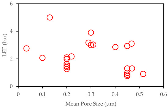 Figure 4. Summary of LEP over mean pore sizes (data obtained from references [43,45,48,52,115,116,117,118,119,120,121,122,123]).