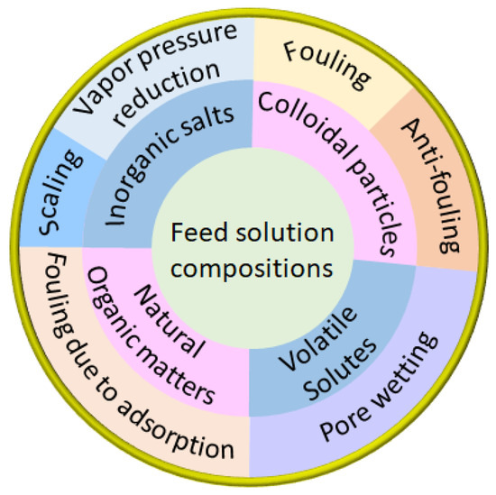 Figure 5. General mechanisms of feed solution compositions affecting permeate flux and salt rejection in MD.