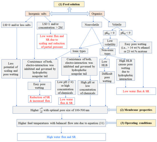 However, there is a lack of systematic overview of factors affecting the water flux, salt rejection, and interactive correlations of both in terms of membrane properties, feedwater chemistry, long-term operation, and their physicochemical interactions for MD applications, especially in desalination. For example, a research paper by Schofield et al. [86] studied the factors affecting flux using sensitivity analysis. They concluded that vapor pressure reduction was the dominant factor for the flux decline of sodium chloride solution, while the viscosity for sucrose solution was the primary factor reducing the flux. Nevertheless, they did not analyze the effect of other factors such as membrane properties, the chemistry of the feed solution, and module parameters on water flux.