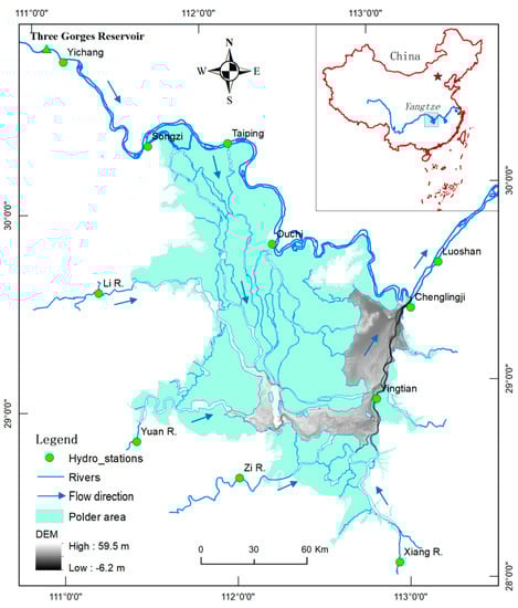 The Yangtze River floodplain once contained hundreds of lakes, which freely connected with the Yangtze River prior to the 1950s. However, human settlement and utilization of catchment resources have exerted great pressures on the lake’s eco-hydrology, by changing their morphology and connectivity with the Yangtze River [,]. As one of the largest shallow lakes in China, the area of the Dongting Lake exceeded 6200 km2 in 1825. Due to sediment deposition and farmland reclamation, its area decreased to 4350 km2 in 1949. A large-scale farmland reclamation around the lake, which started in the 1950s, further decreased the area to the current 2625 km2. The evolution process eventually resulted in a very complicated drainage system in the lake region (Figure 1).