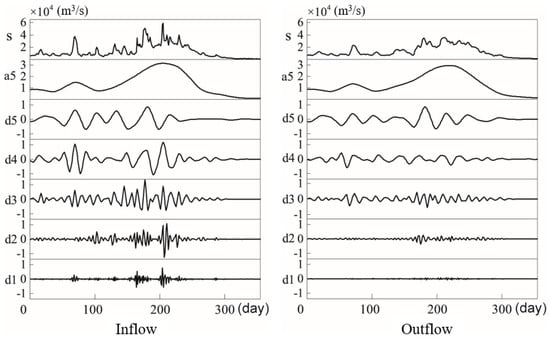 For a large retention lake like Dongting Lake, its real flood process is often formed from the superposition of several flood wavelets with different wavelengths and amplitudes [,]. The wavelength is normally decided by the climate patterns and attributes of the sub-basin where the flood stems from. Influenced by the seasonal variation, the actual flood duration in Dongting Lake is less than two months. Thus, the wavelet analysis was conducted with six timescales, e.g., 2, 4, 8, 16, 32, and 64 days. The comparison between the wavelet decomposition of the inflows and outflows of the lake (Figure 2) shows a significant difference between the high-frequency fluctuations of the inflow and outflow processes in the lake.