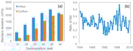 Comparison of the standard deviation (Std) of the wavelet decomposition between inflows and outflows (a), and the removing ratios of the Std for medium- to small-scale flood (b).