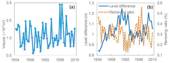 The maximum regulation volume of the lake is often decided by the systematic relationship of inflow discharge, real-time volume in lake, and discharge capability downstream of the outlet of the lake, which is used to reflect the essence changes in a flood regulation system. The maximum regulation volume of the lake each year is calculated based on the maximum inflow combined with the flood peak discharge and the corresponding outflow flood peak discharge (Figure 4a). The daily mean discharge of the largest flood peak of each year reduced by the lake ranges from 5.5 × 108 m3 to 32.1 × 108 m3, and the multi-year mean discharge of the largest flood peaks reduced by the lake is 14.6 × 108 m3. In general, the annual maximum regulation volume does not exhibit a significant tendency of variation, which indicates that the changes in lake volume have not affected the maximum regulation capacity significantly.
