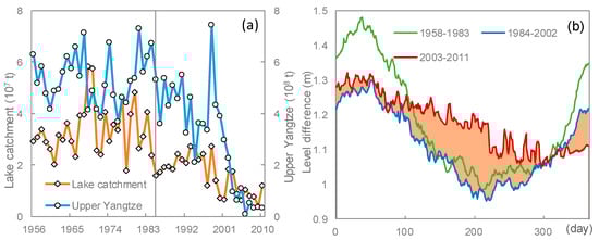 In view of its potential impacts on the flood regulation capacity, the lake–river relationship evolution caused by the operation of the Three Gorges Reservoir has attracted more attention. The long-term decrease of diversion ratio of water and sediment from the Yangtze River to the Dongting Lake is becoming the primary factor affecting the flood regulation capacity [,,]. From Figure 5a, the sediment from the Dongting Lake catchment has start to decrease since 1983, and the sediment from the upper Yangtze has decreased since 2000. Both sources have come into an extremely low period after 2003, and the yearly average sediments decreased to 0.95 × 107 m3 t and 0.55 × 107 m3 t, respectively (62.7% and 88.7% compared with the average before 2003). As a result, the Dongting Lake, for the first time, has changed from trapping to supplying net sediment to the Yangtze River in 2006 []. According to the evaluation, the sediment load around the lake may reach a new balance in more than 50 years []. This will directly affect the water level difference downstream from the outlet of the lake.